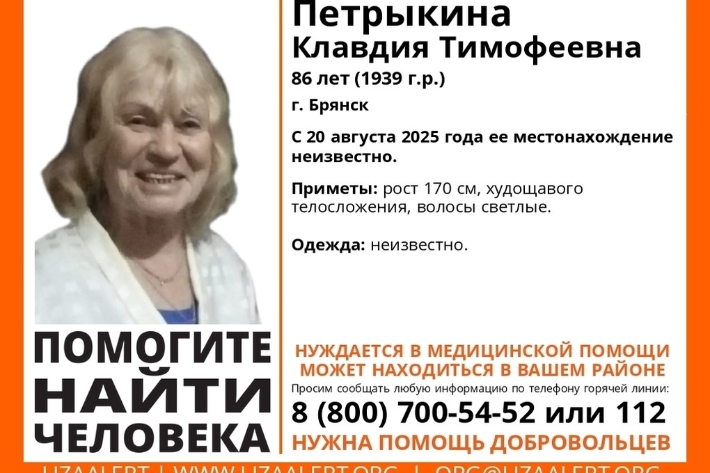 В Брянске пропала 86-летняя Клавдия Петрыкина, в регионе ведутся поиски. Как сообщает поисково-спасательный отряд «ЛизаАлерт», местонахождение пенсионерки неизвестно с 20 августа.